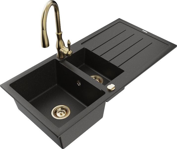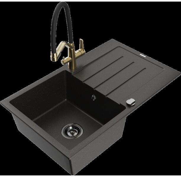 Mexen Gaspar, gránit mosogató 752x436x161 mm, 1,5 kamrás és Carla mosogató csaptelep, fekete-arany metál, 6507-75-670700-00 Gyártó: Mexen Sorozat: Gáspár Modell: 1,5-kamrás, rövid leeresztővel Beépítés: felülről a munkalapba való beágyazáshoz Szín: fekete - arany metál Hossza 737 mm Szélesség 475 mm Magasság: 177 mm Kamra mélysége: 167 mm (nagyobb), 107 mm (kisebb) Kamr