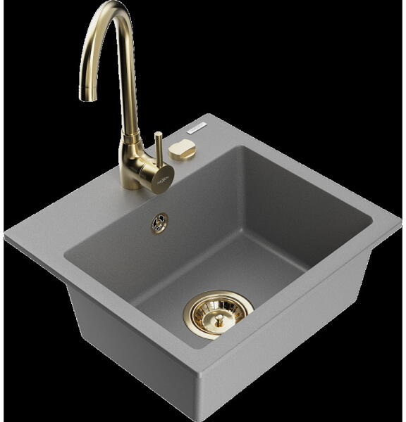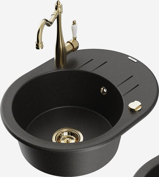 Mexen Kevin, gránit mosogató 586x458x190 mm, 1 kamrás és Carla mosogató csaptelep, fekete-arany metál, 6517-75-670700-50 Gyártó: Mexen Sorozat: Kevin Szín: fekete/arany metál Modell: 1 kamrás, rövid leeresztővel Felszerelés: munkalapra Hossza 586 mm Szélesség 458 mm Magasság: 190 mm Kamra mérete: 378x374 mm Kamra mélysége: 175 mm A lefolyó átmérője: Ø 90 mm Szifon + automa