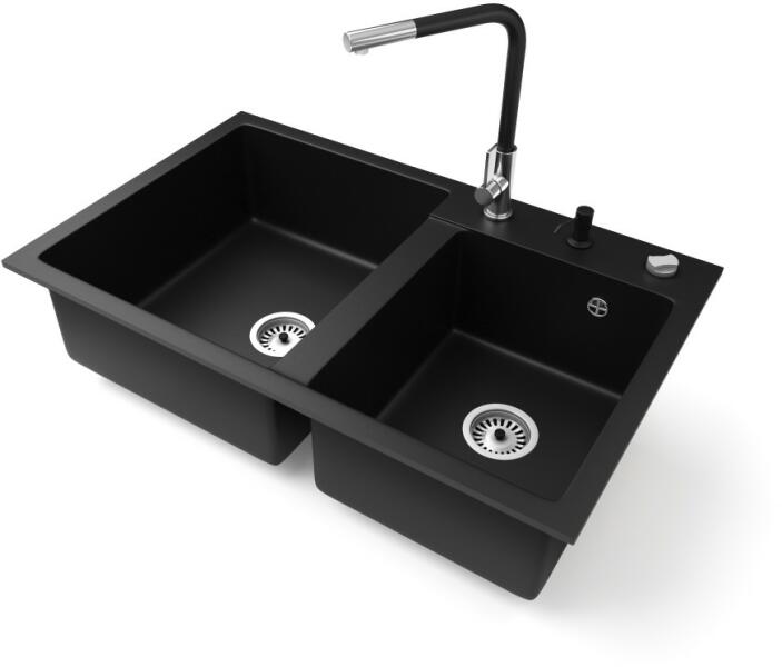 NERO Palazzo gránit mosogatótálca matt fekete színben csapteleppel, automata dugóemelővel és adagolóval. A kétmedencés mosogatótálcák 21. századi csúcsmodellje, ami két nagyméretű medencéjével és különleges kialakításával minden konyha tökéletes eleme lehet. Az asszimetrikus kialakításnak köszönhetően a kisebb medence fölött egy praktikus perem helyezkedik el, ah