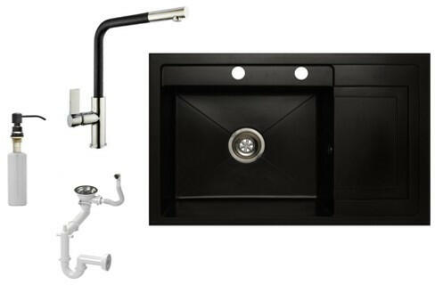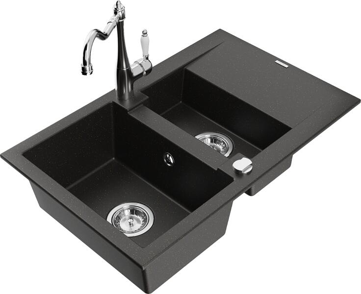 Vancouver gránit mosogató szett szemcsés fekete színben, extra nagy medencés kivitelben. A 38,5 x 48,5 cm-es nagyméretű medence és a csepegtető megkönnyíti a nagyobb edények, lábosok elmosását. A két lyuk felül helyezkedik el, így kényelmes a csap és az adagoló használata. A letisztult szögletes formavilág kiválóan illeszkedik egy modern stílusú konyhába. Ez a mosogat