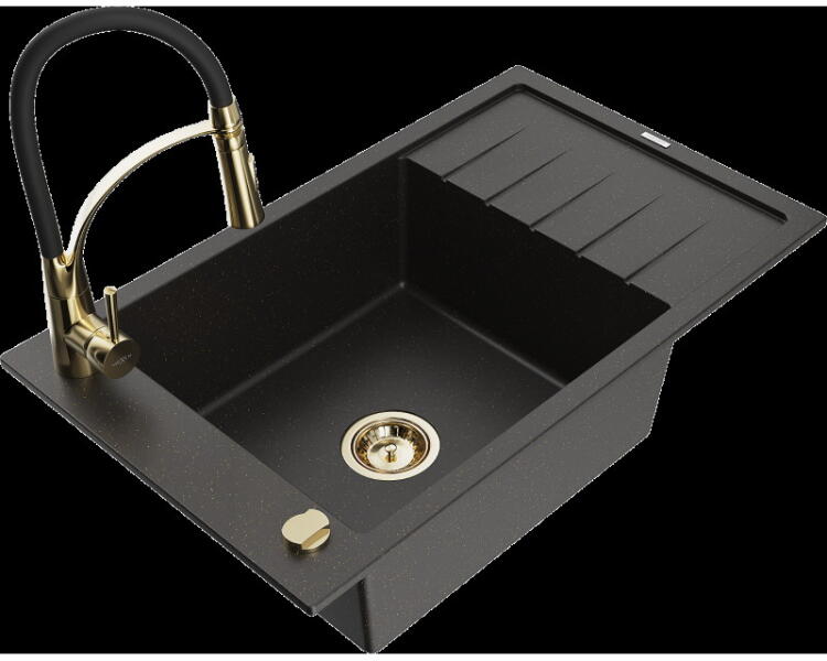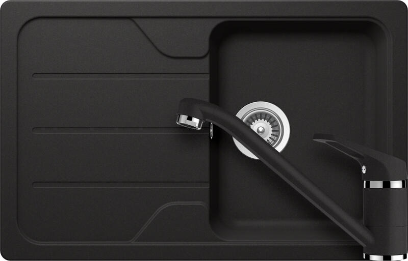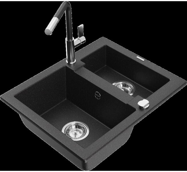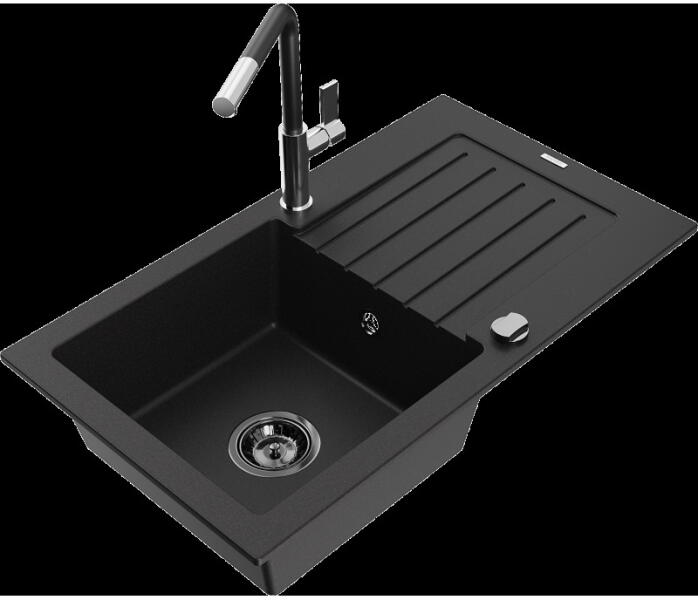 NERO Eris gránit mosogatótálca szemcsés fekete színben, ami 78 x 50 cm-es méretével, valamint a 20 cm mély medencével minden igényt kielégít, mégsem foglal sok helyet a konyhai munkafelületből. Markánsan bordázott, de letisztult csepegtető rész és körben vízvető perem kapott helyet. A mosogatón 2 lyuk található, egy a csaptelepnek és egy a mosogatószer adagolónak vagy