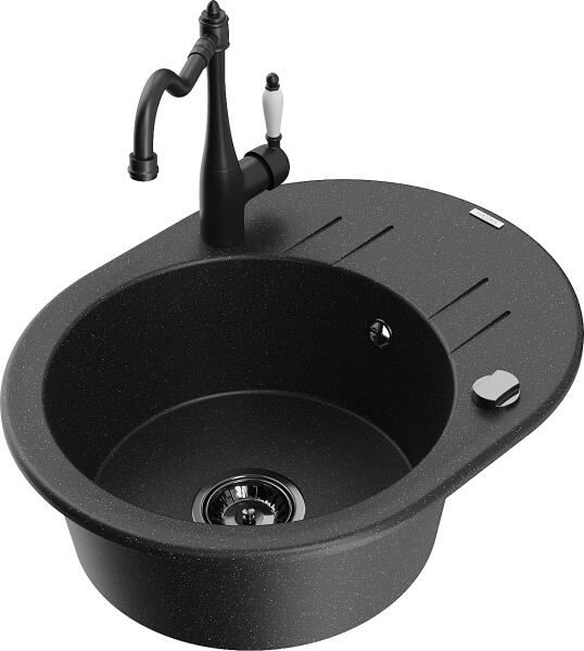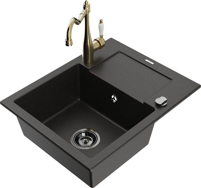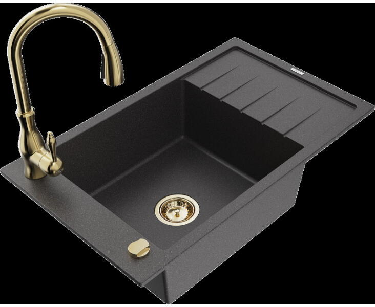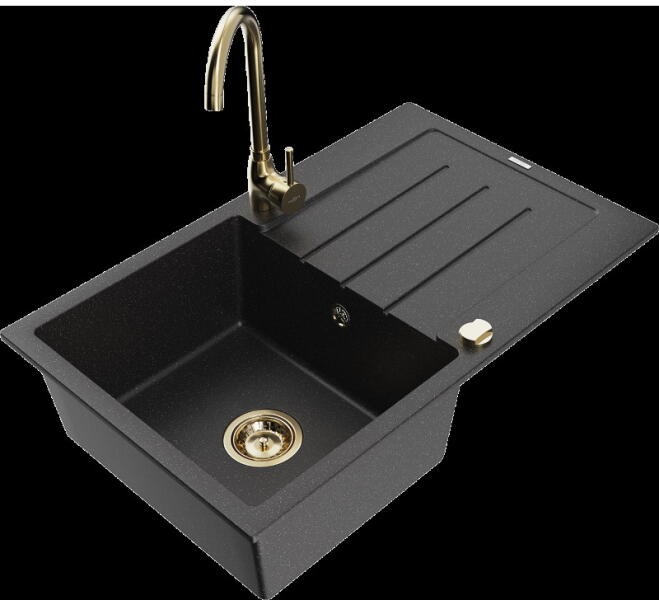 Mexen Enzo, gránit mosogató 576x465x174 mm, 1 kamrás és Carla mosogató csaptelep, fekete-arany metál, 6506-75-670700-50-B Gyártó: Mexen Sorozat: Enzo Modell: 1 kamrás, rövid csepegtetővel Beépítés: felülről a munkalapba süllyesztve Hossza 576 mm Szélesség 465 mm Magasság: 174 mm Szín: fekete/arany metál Kamra mélysége: 164 mm Kamra mérete: 395x320 mm Szifon + automatikus l