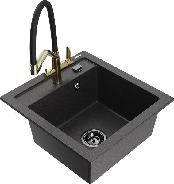 Mexen Bruno, gránit mosogató 795x495x200 mm, 1 kamrás, fekete-arany metál fekete szifonnal és fekete Rita mosogató csapteleppel, 6513-75-670300-70-B Gyártó: Mexen Sorozat: Bruno Modell: 1-kamrás s csepegtetővel Szín: fekete - arany metál Felületkezelés: sima Hossza 795 mm Szélesség 495 mm Magasság: 200 mm Kamra mélysége: 190 mm Kamra mérete: 440x360 mm Szifon + automatikus leer