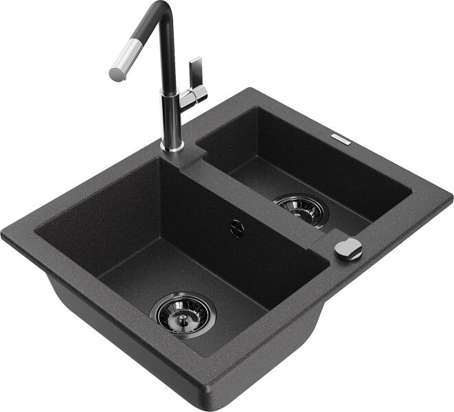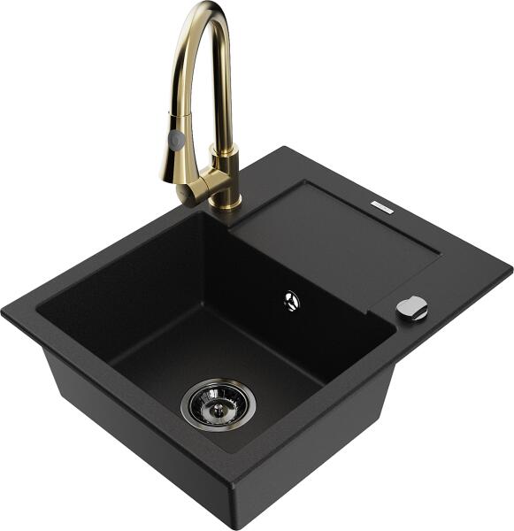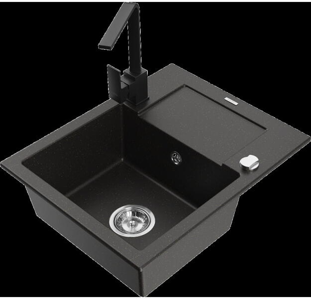 Mexen Kevin, 1 kamrás gránit mosogató 586x458x190 mm és Duero mosogató csaptelep, fekete, 6517-77-671600-70-B Mosogató: Gyártó: Mexen Sorozat: Kevin Modell: 1 kamrás, rövid leeresztővel Beépítés: felülről a munkalapba süllyesztve Hossz: 586 mm Szélesség: 458 mm Magasság: 190 mm Kamra mérete: 378x374 mm Kamra mélysége: 175 mm A lefolyó átmérője: Ø 90 mm Szifon + automati