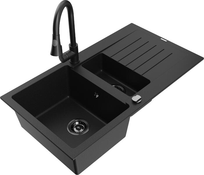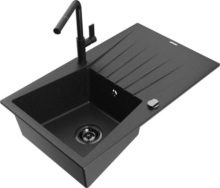 Matias konyhai mosogató: Gyártó: Mexen Sorozat: Matias Modell: 1,5-kamrás lefolyóval Beépítés: felülről a munkalapba való beágyazáshoz Hossz: 900 mm Szélesség: 505 mm Magasság: 200 mm Kamra mélysége: 180 mm (nagyobb), 115 mm (kisebb) Kamra mérete: 435x335 mm (nagyobb), 345x150 mm (kisebb) Lefolyó átmérője: 90 mm Szifon + automatikus leeresztő csavar Anyaga: gránit (80% gr