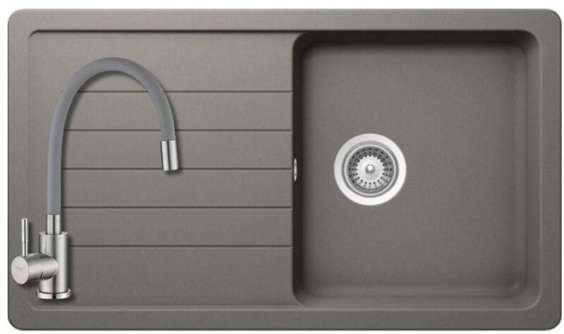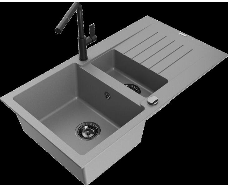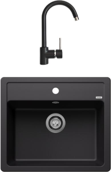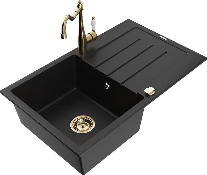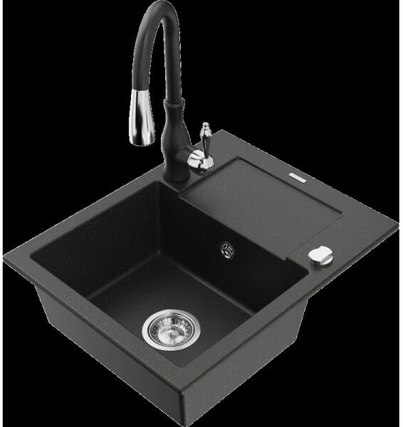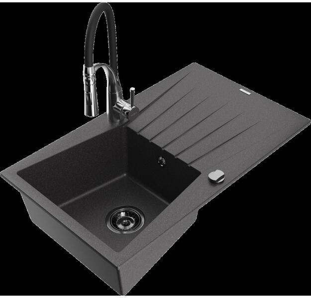 Mexen Pablo, gránit mosogató 752x436x161 mm, 1 kamrás és Carla mosogató csaptelep, fekete-ezüst metál, 6510-73-670700-70 Gyártó: Mexen Sorozat: Pablo Méretek: 752x436x161 mm Kamra mélysége: 151 mm Kamra méretei: 356x332 mm Lefolyó átmérője: ø90 mm Szín: fekete - ezüst metál Típus: 1 kamrás csepegtetővel Típus: felülről a pultba süllyesztve Anyaga: gránit (80% gránit a