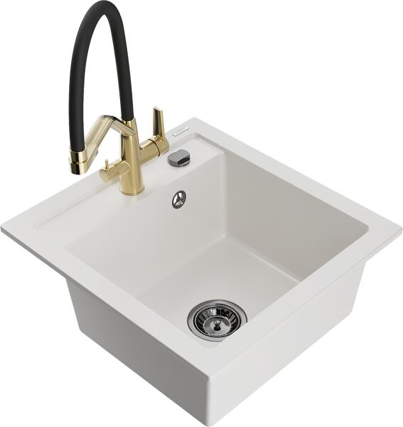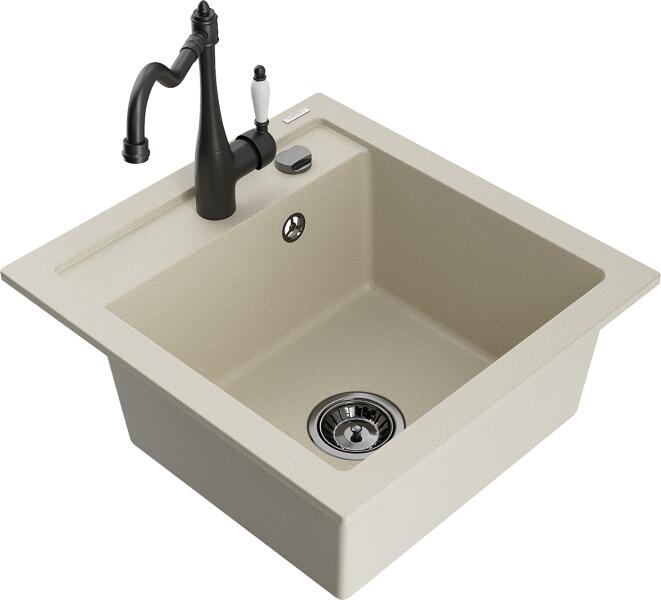 Mexen Vito, gránit mosogató 490x520x210 mm, 1 kamrás és mosogató csaptelep Carla, bézs, 6503-69-670700-70 Vito konyhai mosogató: Méretek: 520x490x210 mm Kamra mélysége: 200 mm Kamra méretei: 410x360 mm Lefolyó átmérője: ø90 mm Szín: bézs Típus: 1 kamrás Típus: a pultba való beágyazáshoz Anyaga: gránit (80% gránit adalékanyag 20% gyanta) Túlfolyó lyuk: igen Lyukak: 2 (1