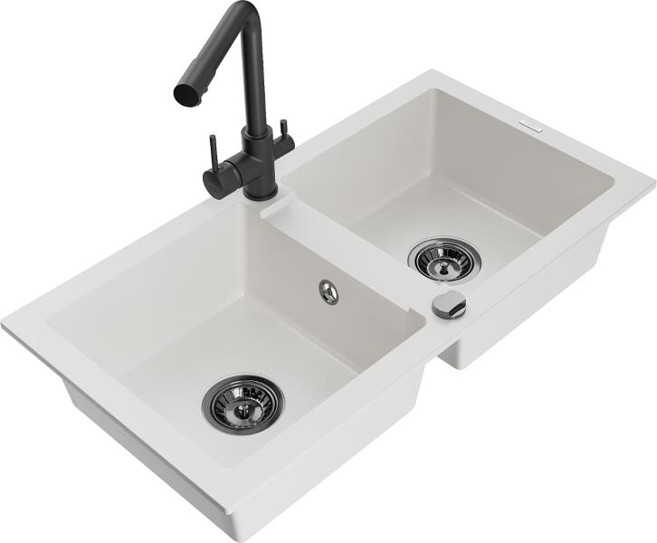 Mexen Mario, 2 kamrás gránit mosogató 820x436x161 mm és fekete Duero mosogató csaptelep, fehér, 6504-20-671600-70 Gyártó: Mexen Sorozat: Mario Termékkód: 6504822000-20 Fehér szín Mérete: 820x436x161 mm Kamra mélysége: 151 mm Kamra méretei: 356x336 mm Lefolyó átmérője: ø90 mm Típus: 2 kamrás Típus: a pultba süllyesztve Anyaga: gránit (80% gránit adalékanyag 20% gyanta) T
