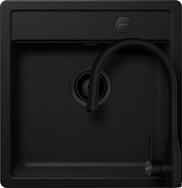 Schock Mono N-100S konyhai mosogatótálca Cristadur Puro 490 x 510 mm lefolyó távműködtetővel, gránit, hagyományos beépítés, intenzív fekete munkalapba beépíthető, egymedencés, csepegtető nélküli, ideálisan illeszkedik a minimum 50 cm-es alsószekrényhez. A csaptelep helye előre elkészített, könnyedén áttörhető. A csomagban találja a használati útmutatót, amely ré