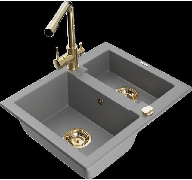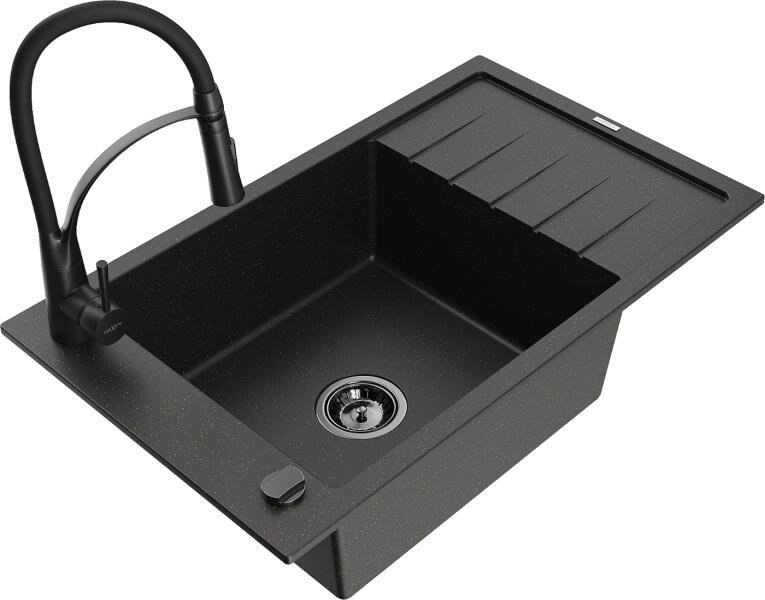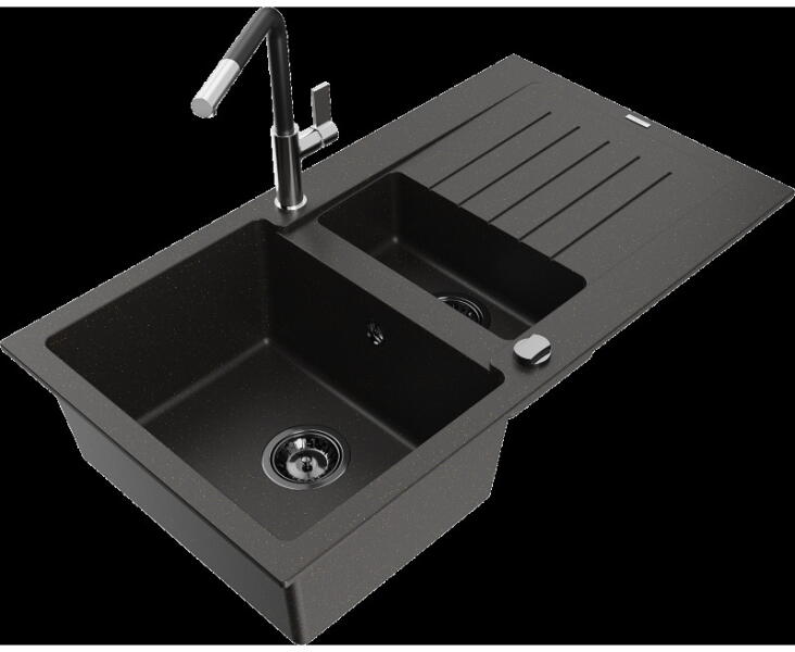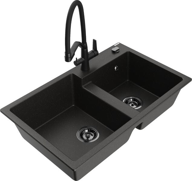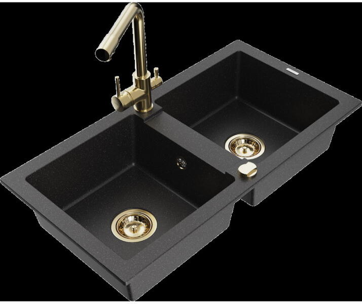 Mexen Tomas, 2 kamrás gránit mosogató 800x500x190 mm és konyhai csaptelep Duo, fekete-arany metál, 6516-75-671701-70-B A konyhai mosogató műszaki adatai: Gyártó: Mexen Sorozat: Tomas Modell: 2-kamrás csepptálca nélkül Felszerelés: munkalapra Szín: fekete - arany metál Felületkezelés: sima Hossza 800 mm Szélesség 500 mm Magasság: 190 mm Kamra mélysége: 180 mm (nagyobb), 180 m
