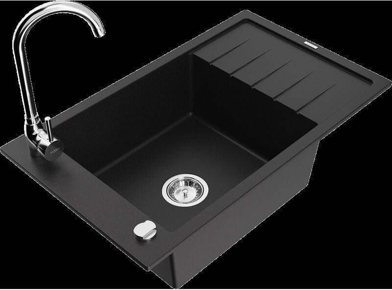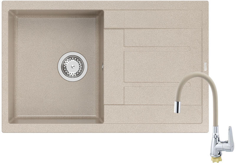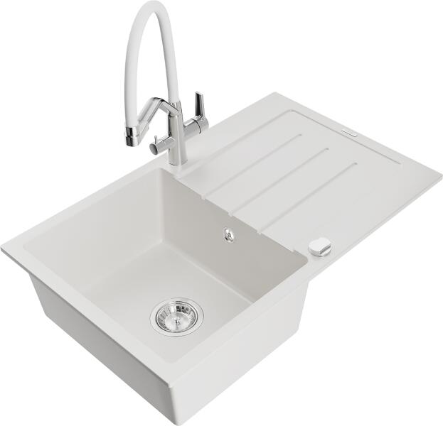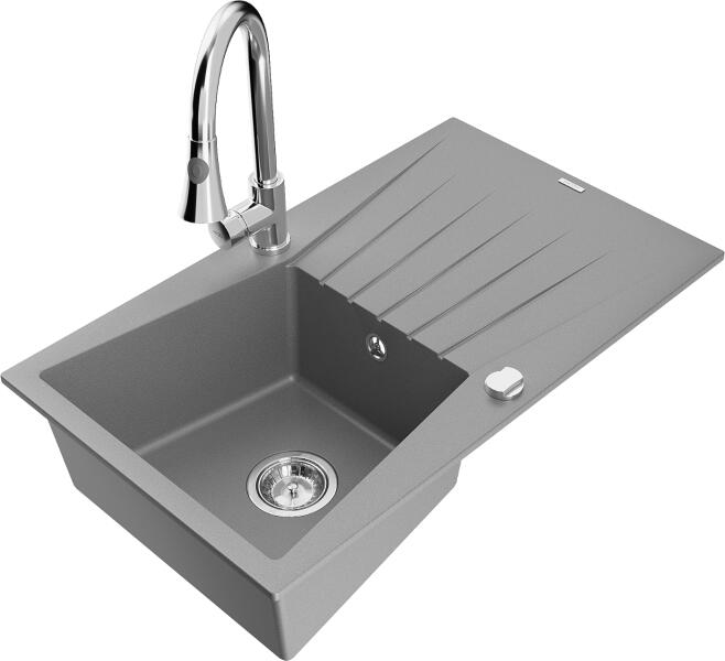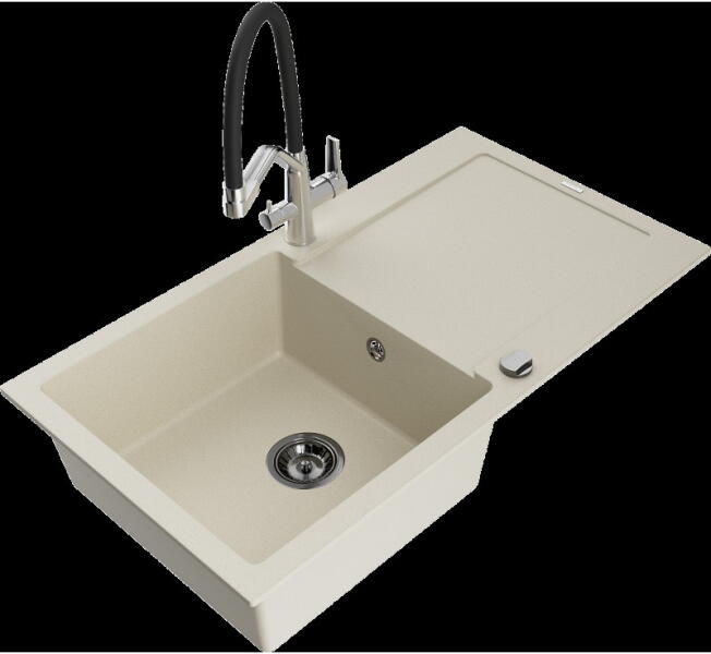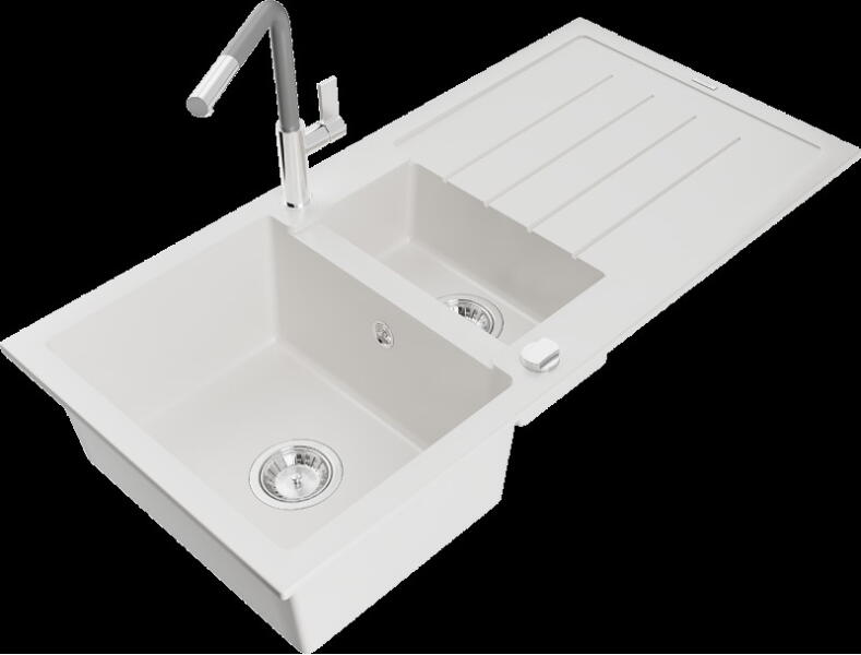 Mexen Elias konyhai mosogató: Gyártó: Mexen Sorozat: Elias Modell: 1 kamrás Beépítés: felülről a munkalapba süllyesztve Méretek: 795x480x200 mm Kamra mélysége: 190 mm Kamra mérete: 465x420 mm Lefolyó átmérője: 90 mm Szifon + automatikus leeresztő csavar Anyaga: gránit (80% gránit - kő, 20% gyanta) Sima felület a könnyű tisztítás érdekében: igen Megnövelt ellenállás