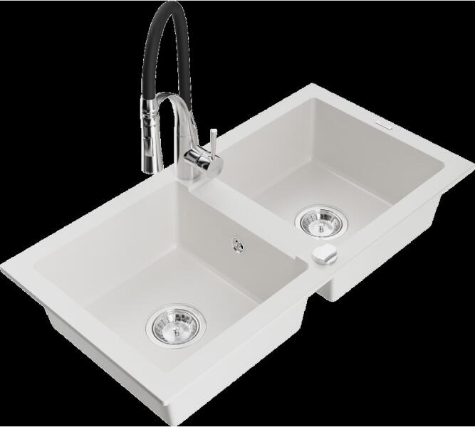 Gyártó: Mexen Sorozat: Bruno + Duo Mosogató: Mérete: 795x495x200 mm Kamra - mélység: 200 mm Kamra méretei: 440x360 mm Kimeneti átmérő: ø90 mm Típus: 1 kamrás csepegtetővel Mosogató típusa: a munkalapba való beágyazáshoz Anyaga: gránit (80% gránit adalékanyag 20% gyanta) Túlfolyó nyílás: Igen Lyukak: 2 (1 lyuk a mosogató csapjához, 1 lyuk az automatikus leeresztő