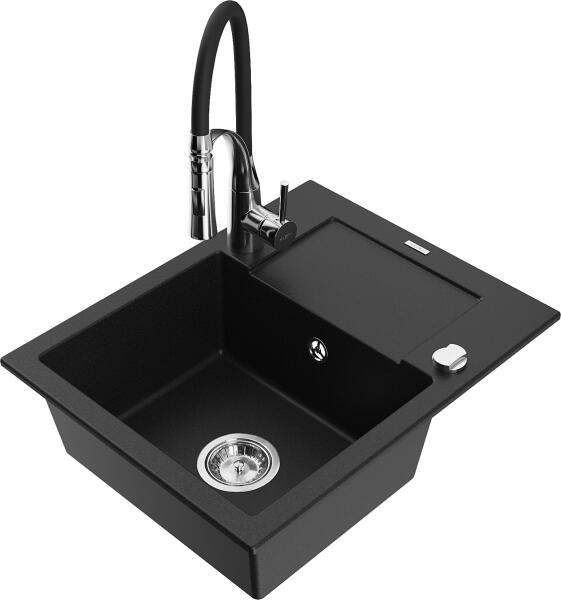Mexen Carlos konyhai mosogató: Gyártó: Mexen Sorozat: Carlos Modell: 1,5-kamrás Beépítés: felülről a munkalapba süllyesztve Méretek: 582x475x177 mm Kamra mélysége: 162 mm (nagyobb), 102 mm (kisebb) Kamra mérete: 395x272 mm (nagyobb), 375x182 mm (kisebb) Lefolyó átmérője: 90 mm Szifon + automatikus leeresztő csavar Anyaga: gránit (80% gránit - kő, 20% gyanta) Sima felület a k