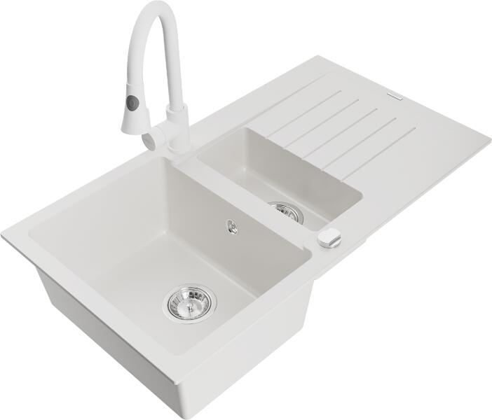 Matias konyhai mosogató: Gyártó: Mexen Sorozat: Matias Modell: 1,5-kamrás lefolyóval Beépítés: felülről a munkalapba való beágyazáshoz Hossz: 900 mm Szélesség: 505 mm Magasság: 200 mm Kamra mélysége: 180 mm (nagyobb), 115 mm (kisebb) Kamra mérete: 435x335 mm (nagyobb), 345x150 mm (kisebb) Lefolyó átmérője: 90 mm Szifon + automatikus leeresztő csavar Anyaga: gránit (80% gr