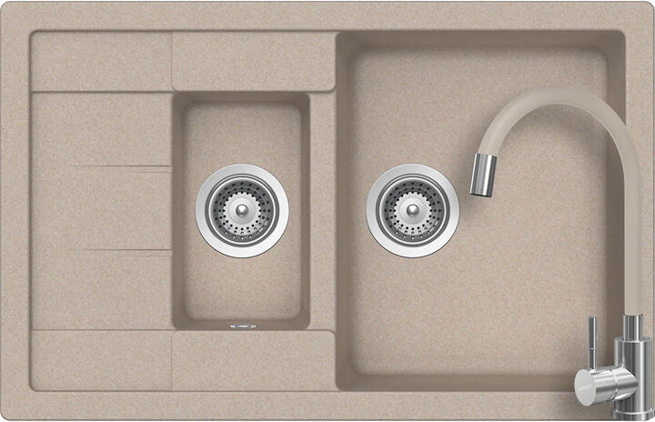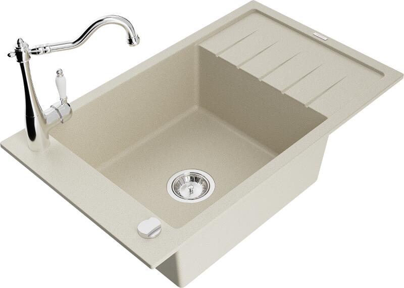 Mexen Elias, gránit mosogató 795x480x200 mm, 1 kamrás és mosogató csaptelep Carla, bézs, 6511-69-670700-00 Elias konyhai mosogató: Szín: bézs Méretek: 795x480x200 mm Kamra mélysége: 190 mm Kamra méretei: 465x420 mm Lefolyó átmérője: ø90 mm Típus: 1 kamrás, rövid csepegtetővel Beépítés: felülről a munkalapba süllyesztve Anyaga: gránit (80% gránit adalékanyag 20% gyant