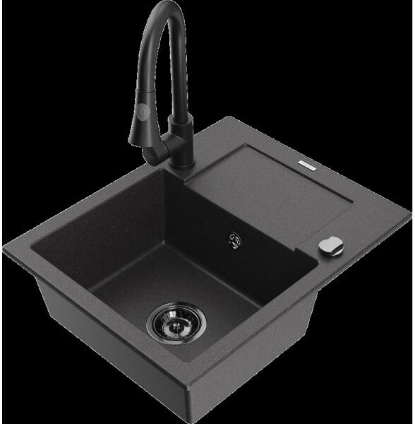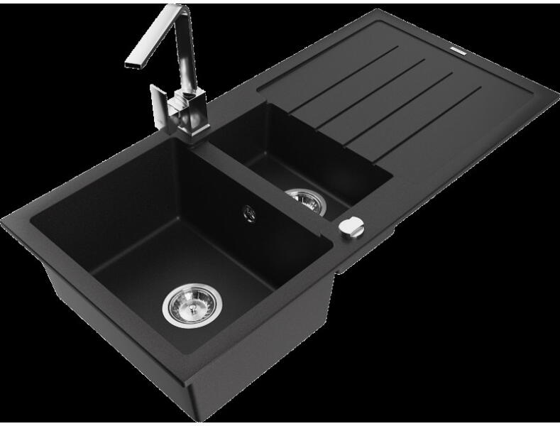 Mexen Carlos, gránit mosogató 582x475x177 mm, 1,5 kamrás és mosogató csaptelep Carla, fekete, 6518-77-670700-70-B Műszaki adatok: Gyártó: Mexen Sorozat: Carlos Modell: 1,5-kamrás csepptálca nélkül Beépítés: felülről a munkalapba süllyesztve Fekete szín Hossza 582 mm Szélesség 475 mm Magasság: 177 mm Kamra mélysége: 162 mm (nagyobb), 102 mm (kisebb) Kamra mérete: 395x272 mm