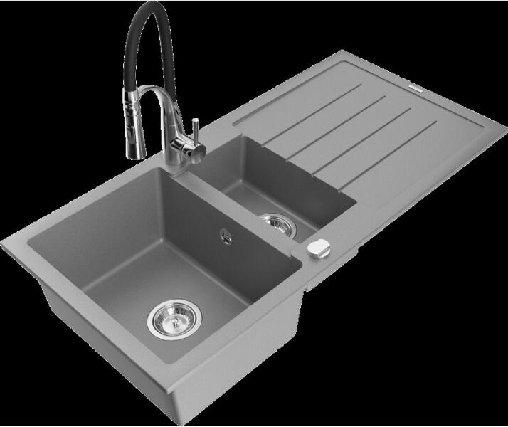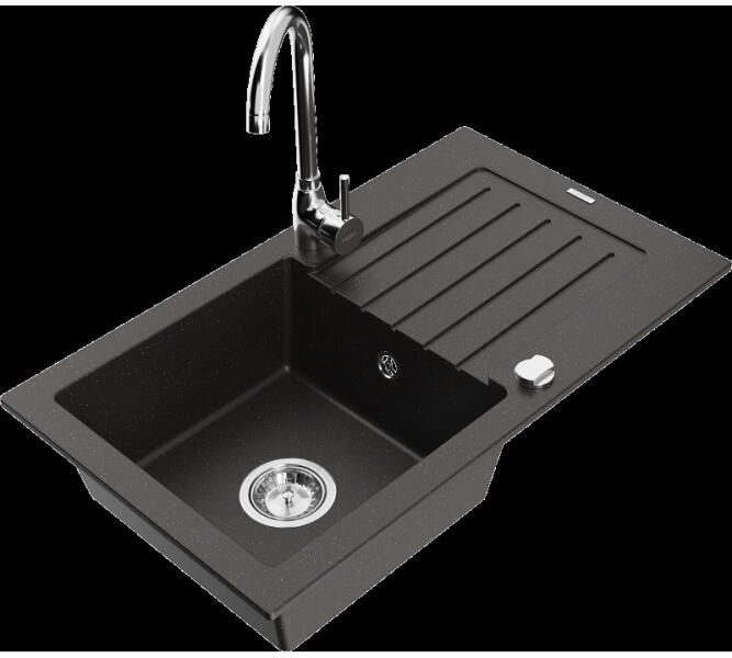 Mexen Gaspar konyhai mosogató: Gyártó: Mexen Sorozat: Gáspár Modell: 1,5-kamrás, rövid csepegtetővel Beépítés: felülről a munkalapba süllyesztve Méretek: 737x475x177 mm Kamra mélysége: 162 mm (nagyobb), 102 mm (kisebb) Kamra mérete: 395x272 mm (nagyobb), 375x182 mm (kisebb) Lefolyó átmérője: 90 mm Szifon + automatikus leeresztő csavar Anyaga: gránit (80% gránit - kő, 20%