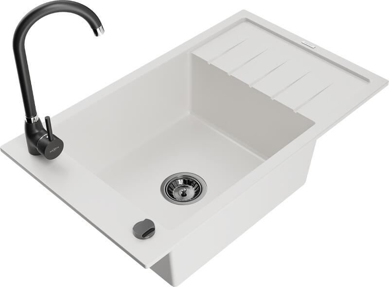 Mexen Elias, 1 kamrás gránit mosogató lefolyóval 795x480x200 mm fekete matt konyhai csaptelep Telma, fehér, 6511-20-670200-70 Elias konyhai mosogató: Termékkód: 6511791005-20 Fehér szín Mérete: 795x480x200 mm Kamra mélysége: 190 mm Kamra méretei: 465x420 mm Lefolyó átmérője: ø90 mm Típus: 1 kamrás, rövid csepegtetővel Típus: a pultba süllyesztve Anyaga: gránit (80% gráni