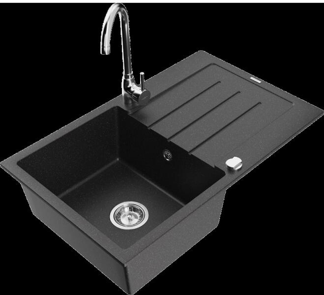 Gyártó: Mexen Sorozat: Cesar + Savita Mosogató: Méretek: 775x470x200 mm Kamra méretei: 410x355 mm Kamra mélysége: 180 mm Lefolyó átmérője: ø90 mm Típus: 1 kamrás lefolyóval Mosogató típusa: a munkalapba való beágyazáshoz Anyaga: gránit (80% gránit adalékanyag 20% gyanta) Túlfolyó nyílás: Igen Lyukak: 2 (1 lyuk a mosogató csaptelepéhez, 1 lyuk az automatikus leeresztőc
