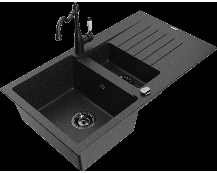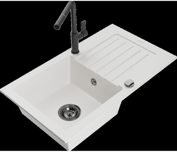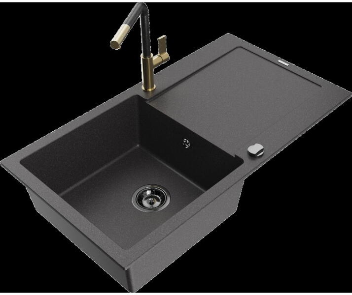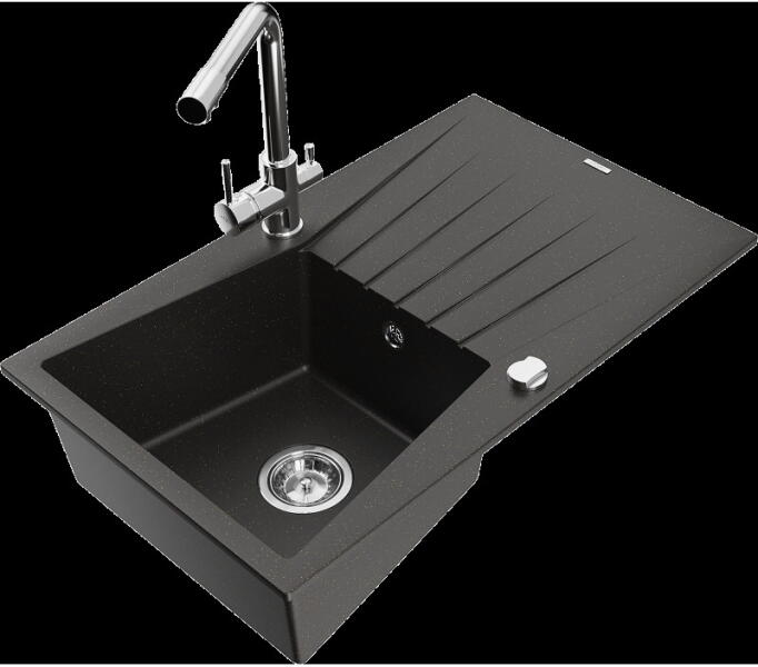 Mexen Bruno, 1 kamrás gránit mosogató csepptálcával 80x50 cm, konyhai csaptelep Telma, fekete, 6513-77-670200-70 Mosogató: Termékkód: 6513791010-77 Mérete: 795x495x200 mm Kamra mélysége: 200 mm Kamra méretei: 440x360 mm Lefolyó átmérője: ø90 mm Típus: 1 kamrás csepptálcával Típus: Az asztallapba süllyesztett Fekete szín Anyaga: gránit (80% gránit adalékanyag 20% gyanta)