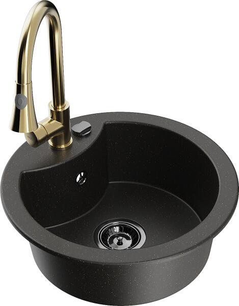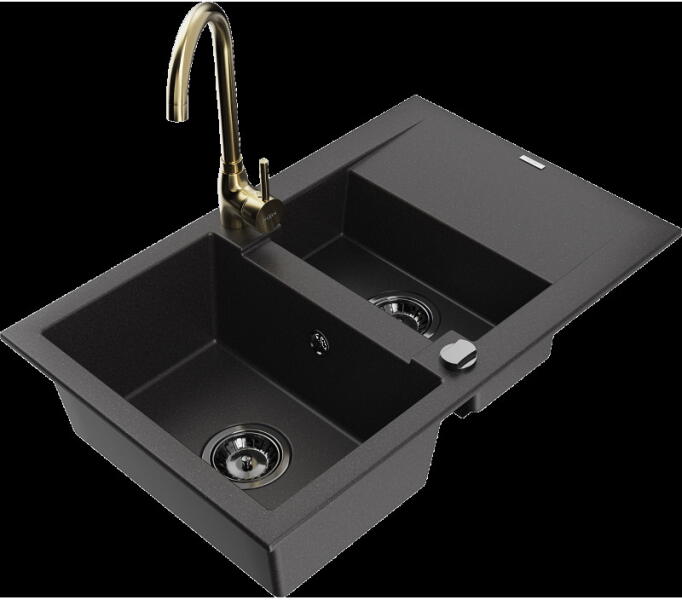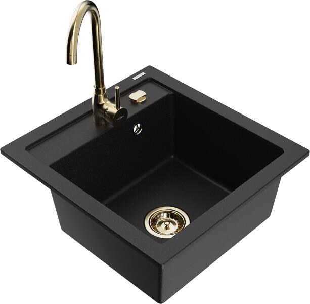 Mexen Bruno, gránit mosogató 795x495x200 mm, 1 kamrás, fekete-arany metál króm szifonnal és fekete Rita mosogató csapteleppel, 6513-75-670300-70 Gyártó: Mexen Sorozat: Bruno Modell: 1-kamrás s csepegtetővel Szín: fekete - arany metál Felületkezelés: sima Hossza 795 mm Szélesség 495 mm Magasság: 200 mm Kamra mélysége: 190 mm Kamra mérete: 440x360 mm Szifon + automatikus leeresz