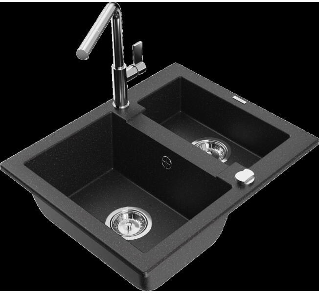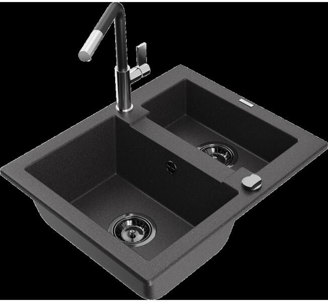 Mexen Vito, 1 kamrás gránit mosogató és Telma konyhai csaptelep, fekete, 6503-77-670200-50 Mosogató: Termékkód: 6503521000-77 Mérete: 520x490x210 mm Kamra mélysége: 200 mm Kamra méretei: 410x360 mm Lefolyó átmérője: ø90 mm Típus: 1 kamrás Típus: Az asztallapba süllyesztett Fekete szín Anyaga: gránit (80% gránit adalékanyag 20% gyanta) Túlfolyó nyílás: Igen Lyukak: (csap