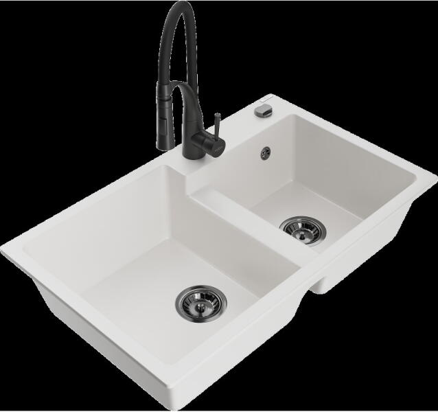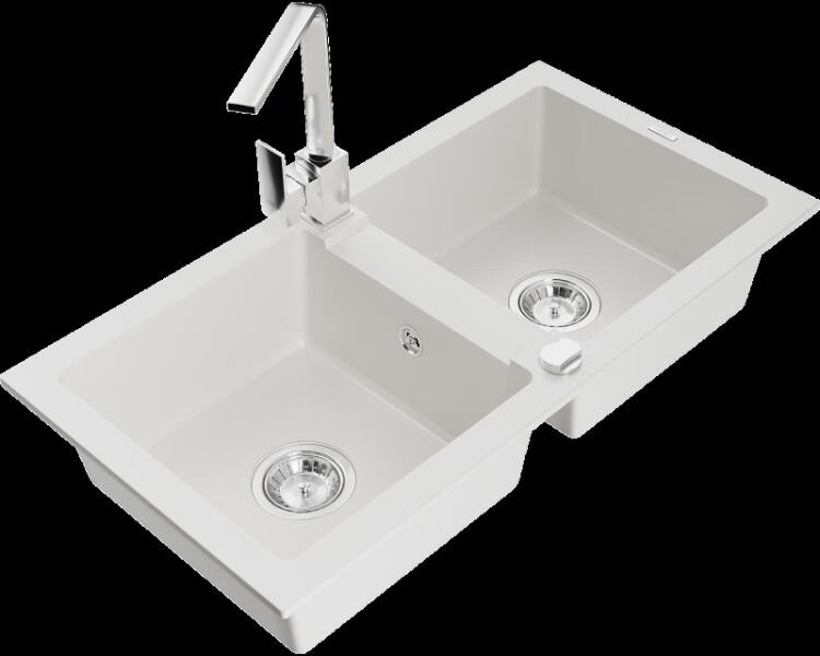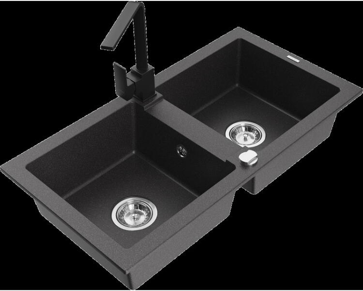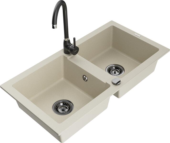 Mexen Mario, 2 kamrás gránit mosogató 820x436x161 mm és Telma fekete mosogató csaptelep, bézs, 6504-69-670200-70 Gyártó: Mexen Sorozat: Mario Termékkód: 6504822000-69 Szín: bézs Mérete: 820x436x161 mm Kamra mélysége: 151 mm Kamra méretei: 356x336 mm Lefolyó átmérője: ø90 mm Típus: 2 kamrás Típus: a pultba süllyesztve Anyaga: gránit (80% gránit adalékanyag 20% gyanta) T