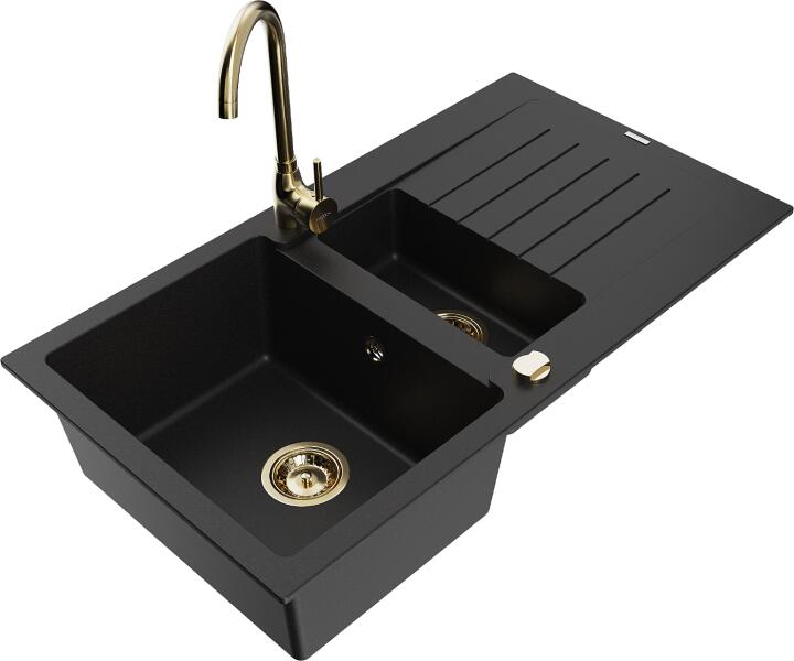 Mexen Matias, 1,5 kamrás gránit mosogató 90x50 cm-es csepptálcával Telma konyhai csapteleppel, fekete, 6502-77-670200-50 Mosogató: Termékkód: 6502901505-77 Mérete: 900x505x200 mm Kamra mélysége: 180 mm (nagyobb), 115 mm (kisebb) Kamra méretei: 435x335 mm (nagyobb), 345x150 mm (kisebb) Lefolyó átmérője: ø90 mm Típus: 1,5-kamrás, rövid csepegtetőtálcával Típus: Az asztallapba