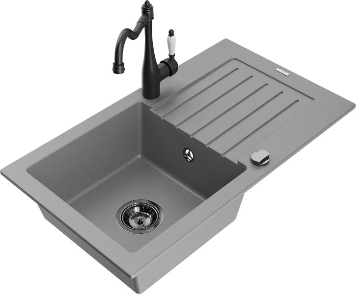 Mexen Pablo, 1 kamrás gránit mosogató 752x436x161 mm és Carla mosogató csaptelep, szürke, 6510-71-670700-70-B Gyártó: Mexen Sorozat: Pablo Méretek: 752x436x161 mm Kamra mélysége: 151 mm Kamra méretei: 356x332 mm Lefolyó átmérője: ø90 mm Szín: szürke Típus: 1 kamrás csepegtetővel Típus: felülről a pultba süllyesztve Anyaga: gránit (80% gránit adalékanyag 20% gyanta) Tú
