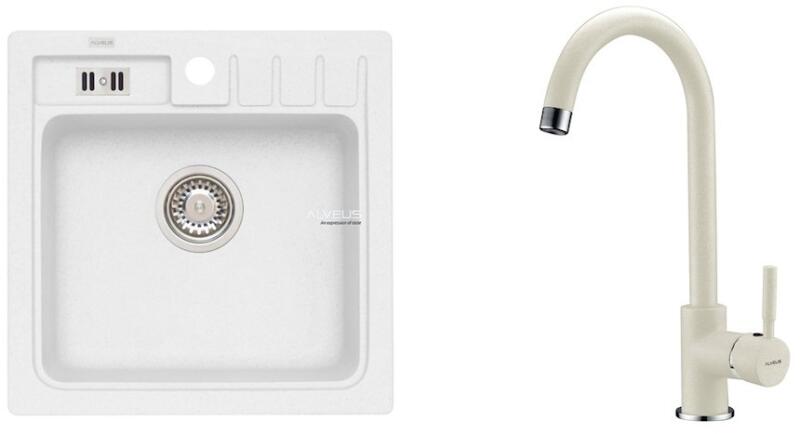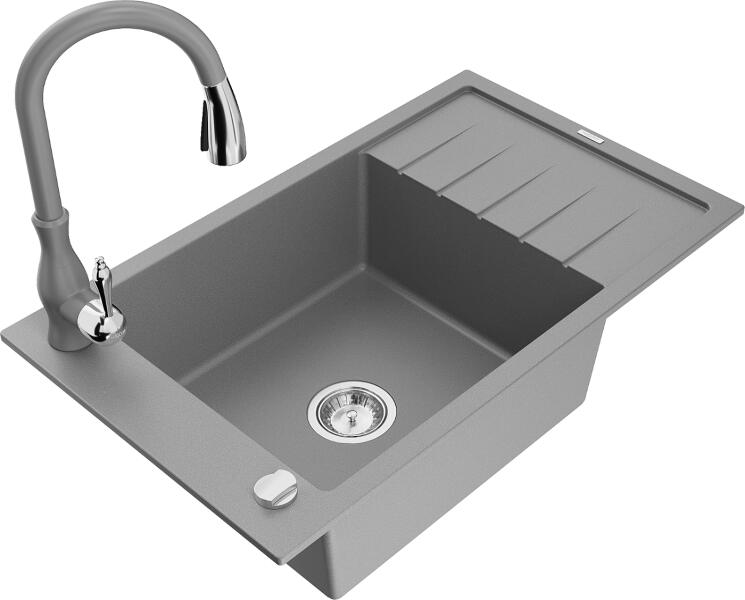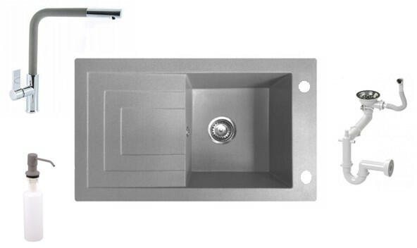 Nero Cortina gránit mosogató szürke színben. A teljes készlet tartalmazza a mosogatót, a csaptelepet, a szifonkészletet és a mosogatószer adagolót. A csaptelep és az adagoló a medence külső peremén helyezkedik el, így biztosítva több helyet és jobb hozzáférést a csepegtető részhez, mindemellett modernebb megjelenést is eredményez. Letisztult, szögletes formavilág jellem
