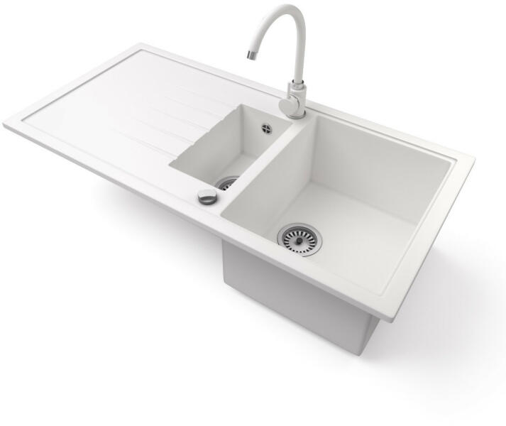Mario konyhai mosogató: Méretek: 820x436x161 mm Kamra mélysége: 151 mm Kamra méretei: 356x336 mm Lefolyó átmérője: ø90 mm Típus: 2 kamrás Típus: felülről a munkalapba süllyesztve Anyaga: gránit (80% gránit adalékanyag 20% gyanta) Túlfolyó lyuk: igen Lyukak: 2 (1 x mosogató csaptelep, 1 x automatikus leeresztő csavar vezérlés) Nagy ellenállás a karcolásokkal és el