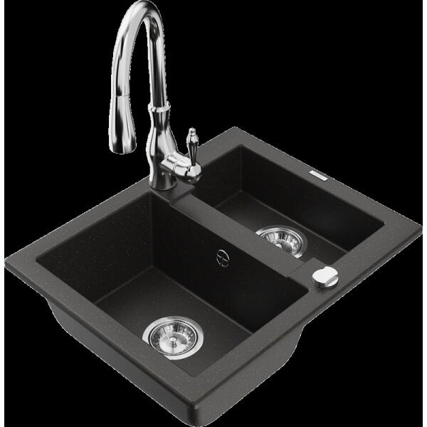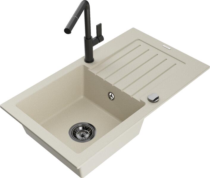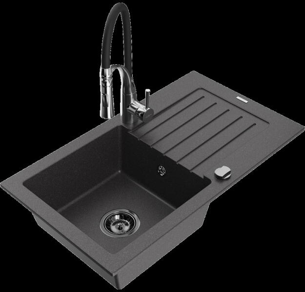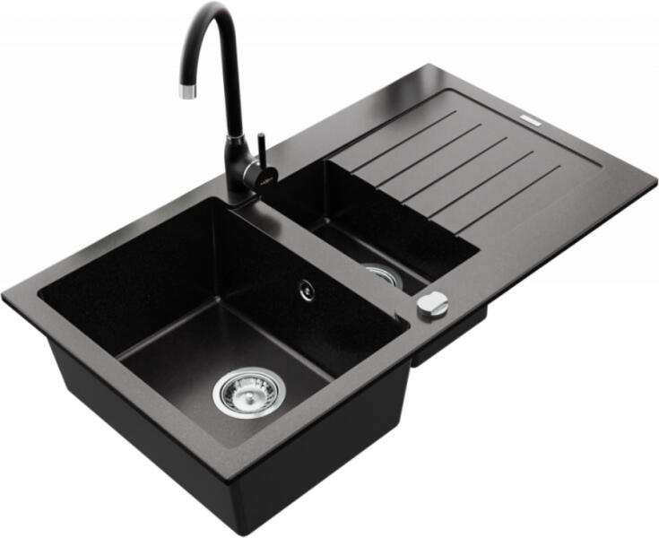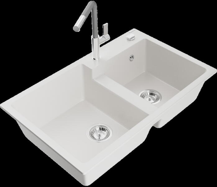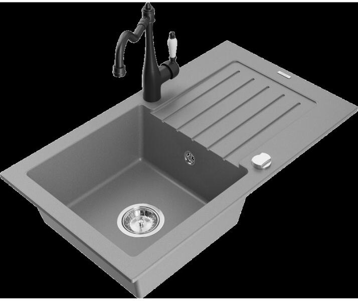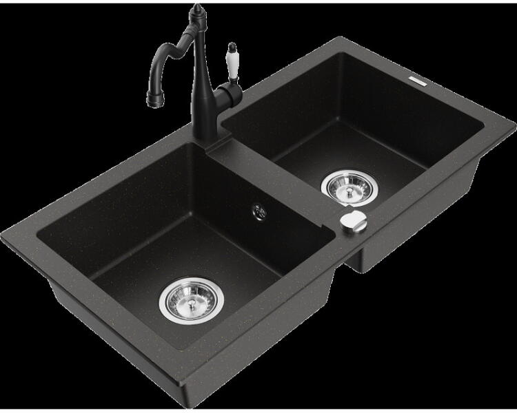 Gyártó: Mexen Sorozat: Cesar + Savita Mosogató: Méretek: 775x470x200 mm Kamra méretei: 410x355 mm Kamra mélysége: 180 mm Lefolyó átmérője: ø90 mm Típus: 1 kamrás lefolyóval Mosogató típusa: a munkalapba való beágyazáshoz Anyaga: gránit (80% gránit adalékanyag 20% gyanta) Túlfolyó nyílás: Igen Lyukak: 2 (1 lyuk a mosogató csaptelepéhez, 1 lyuk az automatikus leeresztőc