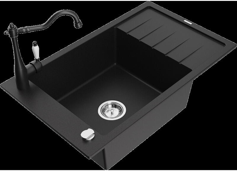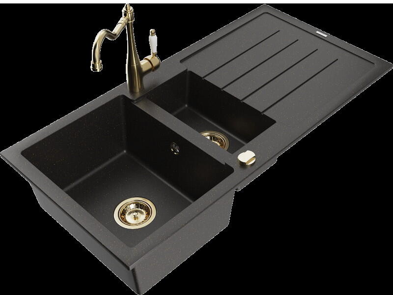Mexen Mario, gránit mosogató 820x436x161 mm, 2 kamrás, fekete, fekete szifonnal és fekete Rita mosogató csapteleppel, 6504-77-670300-70-B Gyártó: Mexen Sorozat: Mario Modell: 2 kamrás Fekete szín Felületkezelés: sima Felszerelés: munkalapra Hossza 820 mm Szélesség 436 mm Magasság: 161 mm Kamra mélysége: 151 mm Kamra mérete: 356x336 mm Lefolyó átmérője: 90 mm Szifon + automati