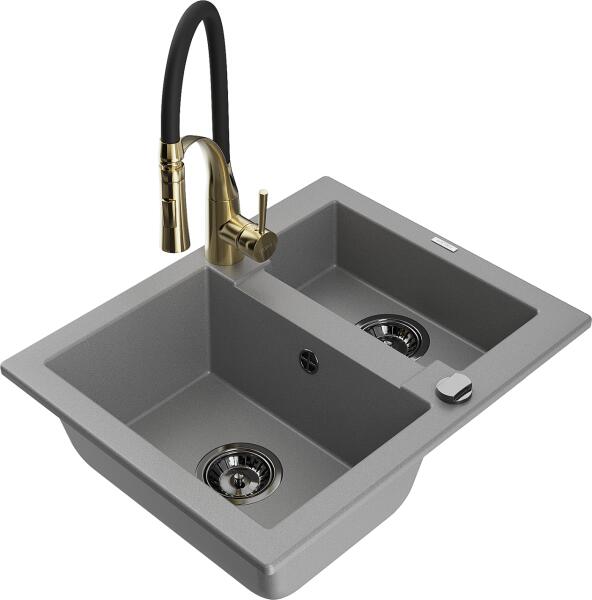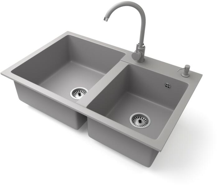 NERO Palazzo gránit mosogatótálca szürke színben csapteleppel és adagolóval. A kétmedencés mosogatótálcák 21. századi csúcsmodellje, ami két nagyméretű medencéjével és különleges kialakításával minden konyha tökéletes eleme lehet. Az asszimetrikus kialakításnak köszönhetően a kisebb medence fölött egy praktikus perem helyezkedik el, ahol helyet kapott a csaptelep.