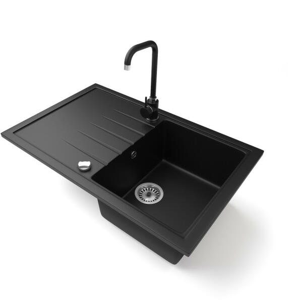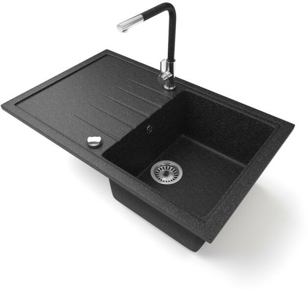 NERO Eris gránit mosogatótálca szemcsés fekete színben, ami 78 x 50 cm-es méretével, valamint a 20 cm mély medencével minden igényt kielégít, mégsem foglal sok helyet a konyhai munkafelületből. Markánsan bordázott, de letisztult csepegtető rész és körben vízvető perem kapott helyet. A mosogatón 2 lyuk található, egy a csaptelepnek és egy a mosogatószer adagolónak vagy