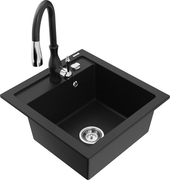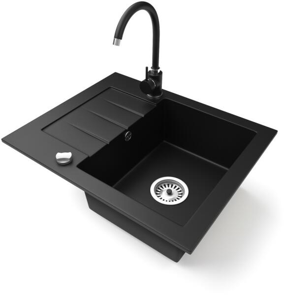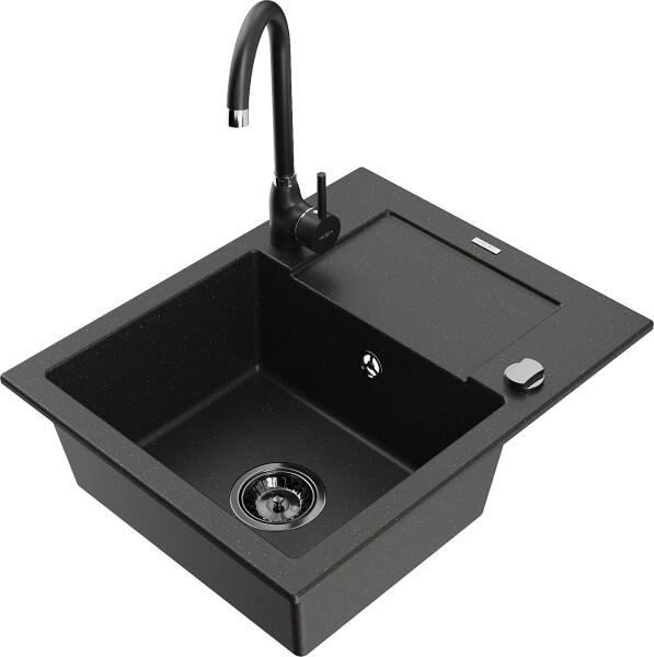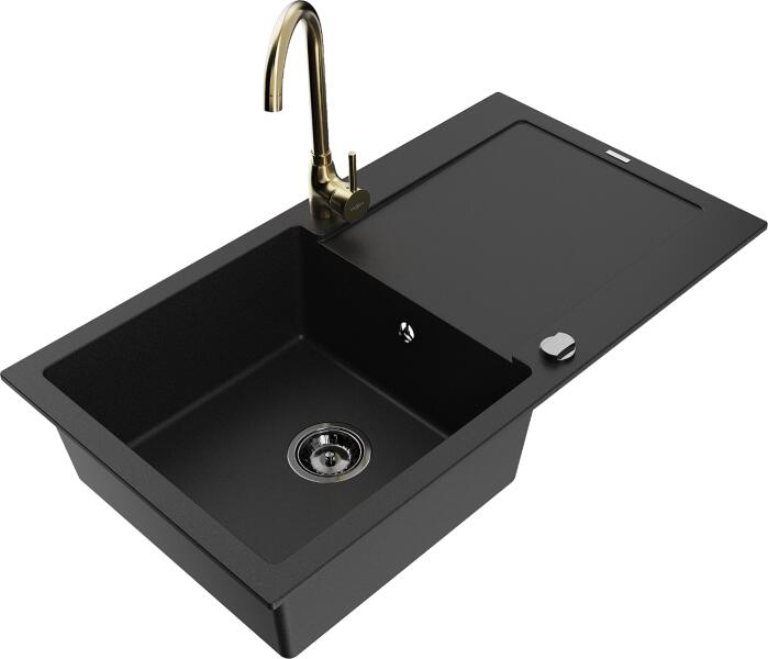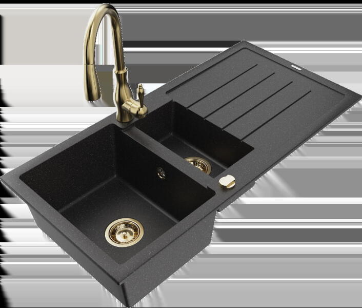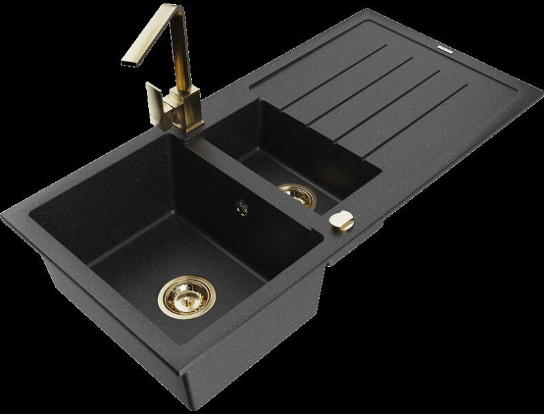 Mexen Enzo, gránit mosogató 576x465x174 mm, 1 kamrás, fekete Telma csaptelep, fekete-arany metál, 6506-75-670200-70-B Gyártó: Mexen Sorozat: Enzo Modell: 1 kamrás, rövid csepegtetővel Hossza 576 mm Szélesség 465 mm Magasság: 174 mm Szín: fekete - arany metál Kamra mélysége: 164 mm Kamra mérete: 395x320 mm Szifon + automatikus leeresztő csavar Anyaga: gránit (80% gránit - kő, 2
