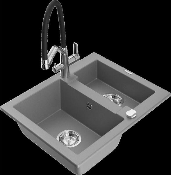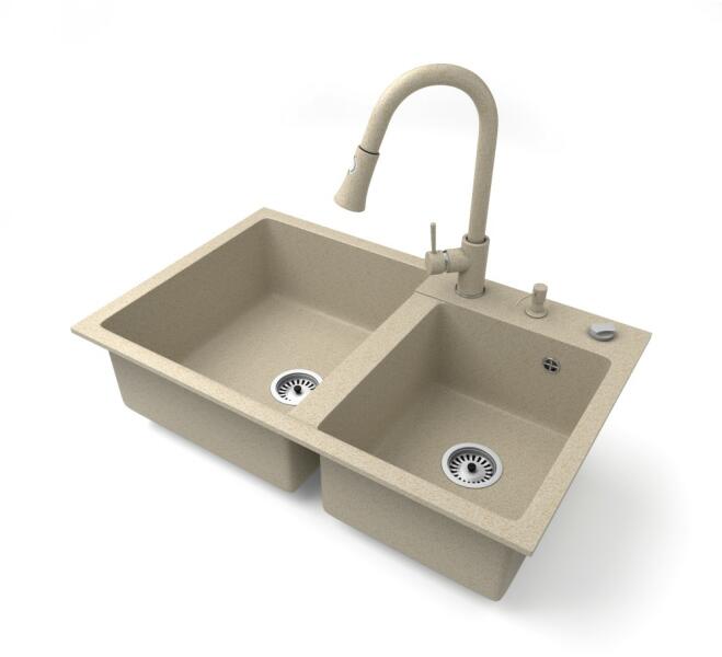 NERO Palazzo gránit mosogatótálca homokbézs színben csapteleppel, automata dugókiemelővel és adagolóval. A kétmedencés mosogatótálcák 21. századi csúcsmodellje, ami két nagyméretű medencéjével és különleges kialakításával minden konyha tökéletes eleme lehet. Az asszimetrikus kialakításnak köszönhetően a kisebb medence fölött egy praktikus perem helyezkedik el, a