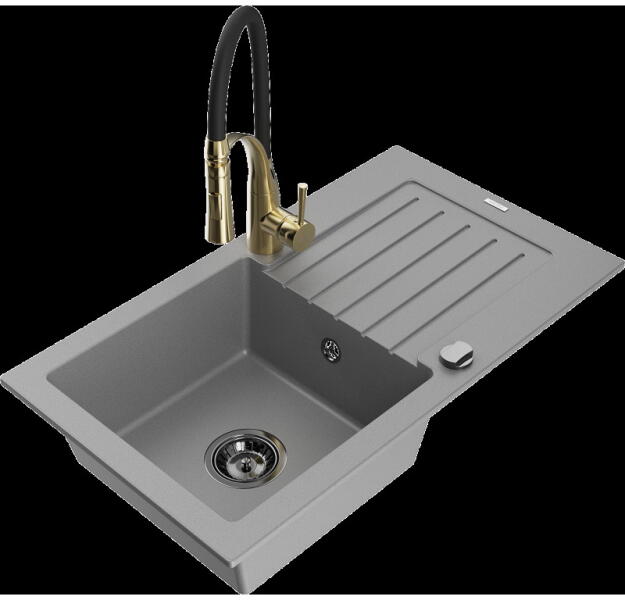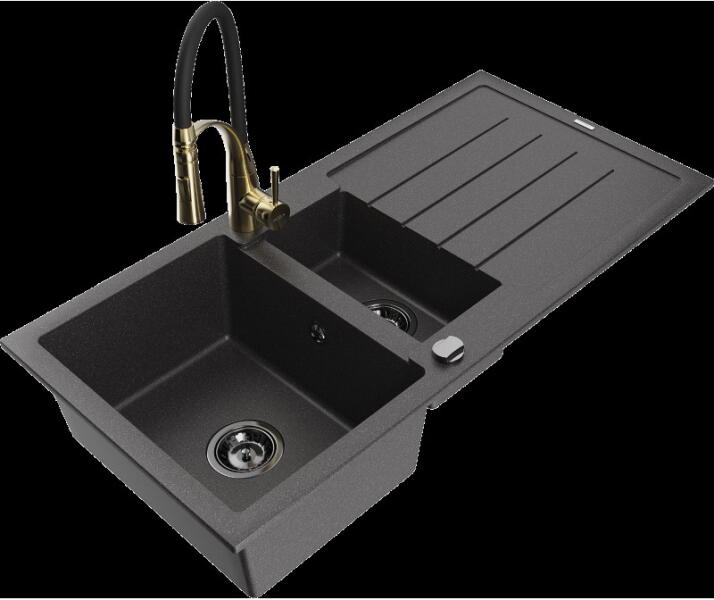 Mexen Gaspar konyhai mosogató: Gyártó: Mexen Sorozat: Gáspár Modell: 1,5-kamrás, rövid csepegtetővel Beépítés: felülről a munkalapba süllyesztve Méretek: 737x475x177 mm Kamra mélysége: 162 mm (nagyobb), 102 mm (kisebb) Kamra mérete: 395x272 mm (nagyobb), 375x182 mm (kisebb) Lefolyó átmérője: 90 mm Szifon + automatikus leeresztő csavar Anyaga: gránit (80% gránit - kő, 20%