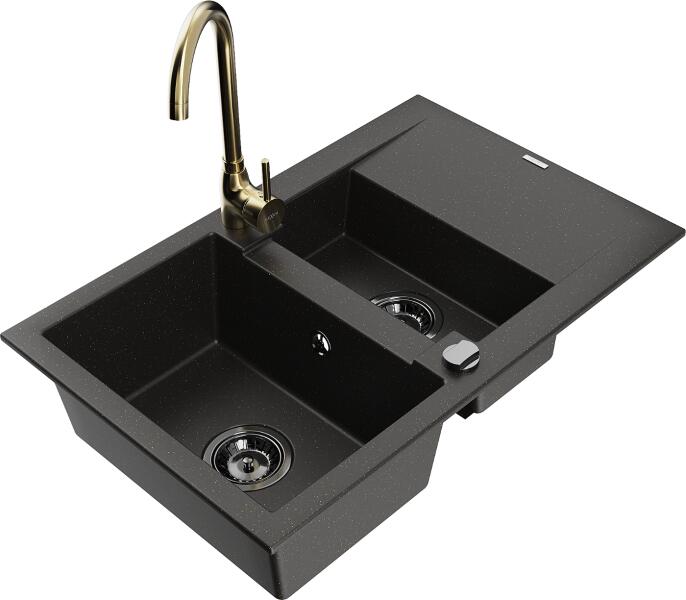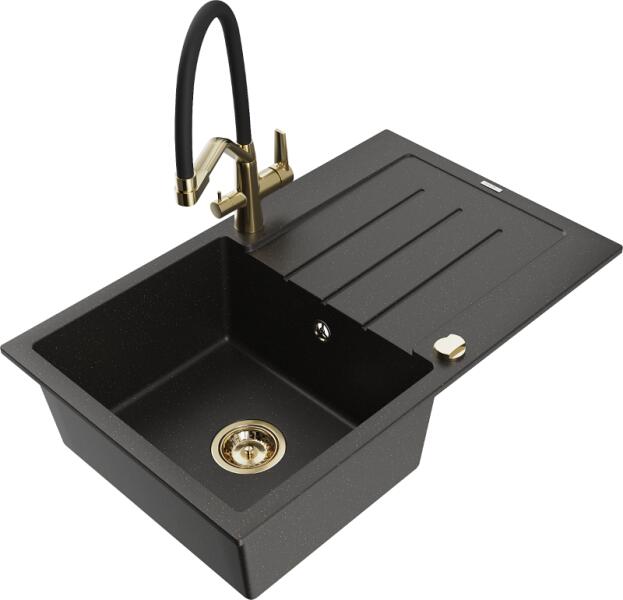 Mexen Gaspar, gránit mosogató 737x475x177 mm, 1,5 kamrás és Telma arany csaptelep, fekete-arany metál, 6507-75-670200-50-B Gyártó: Mexen Sorozat: Gáspár Modell: 1,5-kamrás, rövid leeresztővel Felszerelés: munkalapra Szín: fekete - arany metál Hossza 737 mm Szélesség 475 mm Magasság: 177 mm Kamra mélysége: 167 mm (nagyobb), 107 mm (kisebb) Kamra mérete: 395x272 mm (nagyobb), 37