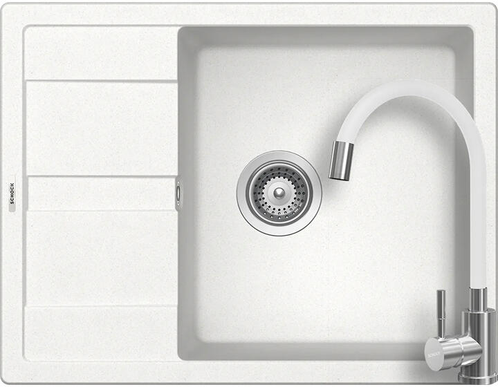Schock Ronda D-100L konyhai mosogatótálca Cristalite Alpina 650 x 500 mm, gránit, megfordítható, hagyományos beépítés, fehér munkalapba beépíthető, egymedencés, megfordítható, csepegtetővel ellátott, ideálisan illeszkedik a minimum 50 cm-es alsószekrényhez. A csaptelep helye előre elkészített, könnyedén áttörhető. A csomagban találja a használati útmutatót, amely r