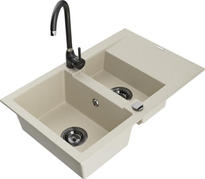 Mexen Gaspar, gránit mosogató 737x475x177 mm, 1,5 kamrás és fekete Telma csaptelep, bézs, 6507-69-670200-70 Gyártó: Mexen Sorozat: Gáspár Modell: 1,5-kamrás, rövid leeresztővel Felszerelés: munkalapra Szín: bézs Hossza 737 mm Szélesség 475 mm Magasság: 177 mm Kamra mélysége: 167 mm (nagyobb), 107 mm (kisebb) Kamra mérete: 395x272 mm (nagyobb), 375x182 mm (kisebb) Lefolyó átm
