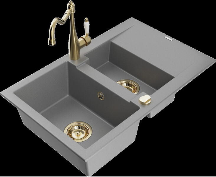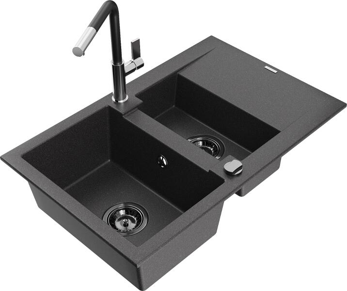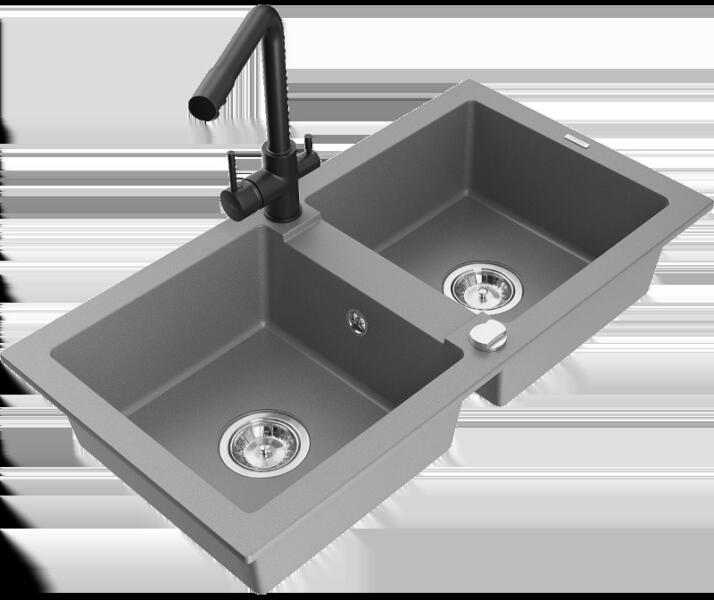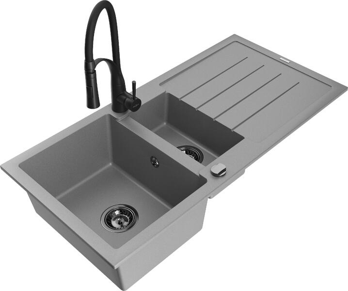 Mosogató: Gyártó: Mexen Sorozat: Andres Méretek: 1000x500x200 mm Kamra mélysége: 190 mm (nagyobb), 115 mm (kisebb) Kamra méretei: 430x330 mm (nagyobb), 340x170 mm (kisebb) Lefolyó átmérője: ø90 mm Típus: 1,5 kamrás csepegtetővel Típus: felülről az asztallapba való beágyazáshoz Anyaga: gránit (80% gránit adalékanyag + 20% gyanta) Túlfolyó nyílás: Igen Gyárilag előkész