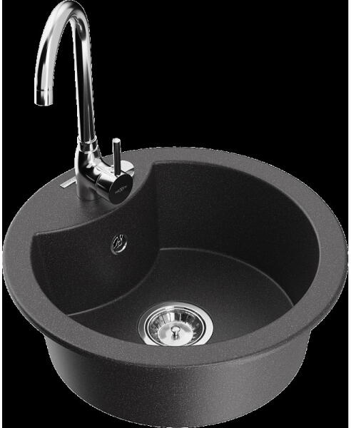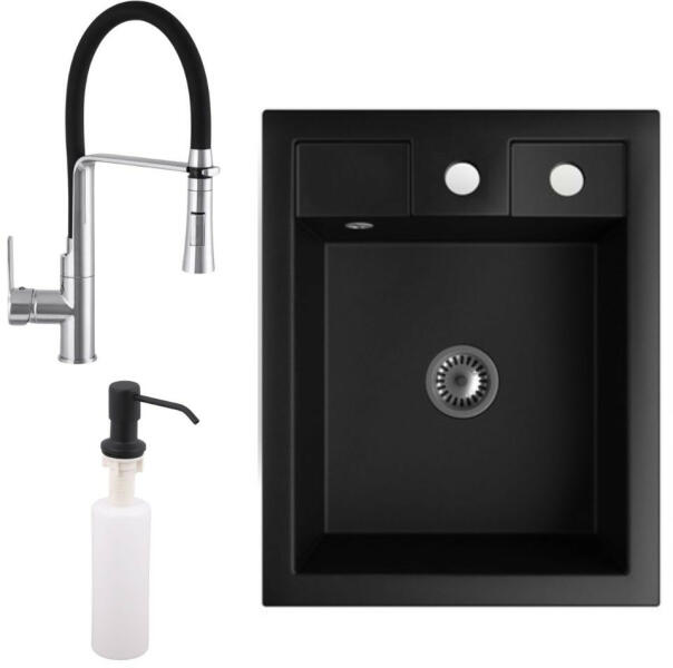 NERO Parma amely kisméretű, de mégis nagyon tágas gránit mosogató csapteleppel, szifonkészlettel, mosogatószer adagolóval, matt fekete színben. Egyik nagy előnye, hogy már egy 40 cm széles konyhabútor elembe is beépíthető, az 50 cm-es mélysége kellő méretet biztosít. A medence mélysége is nagynak számít, 18 cm. Tökéletes bármilyen stílusú konyhába ahol az okos helyk