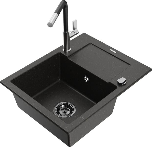 Mexen Kevin, gránit mosogató 586x458x190 mm, 1 kamrás és fekete matt Rita csaptelep, fekete - ezüst metál, 6517-73-670300-70-B Gyártó: Mexen Sorozat: Kevin Modell: 1 kamrás, rövid leeresztővel Felszerelés: munkalapra Hossza 586 mm Szélesség 458 mm Magasság: 190 mm Kamra mérete: 378x374 mm Kamra mélysége: 175 mm A lefolyó átmérője: Ø 90 mm Szifon + automatikus leeresztő csav