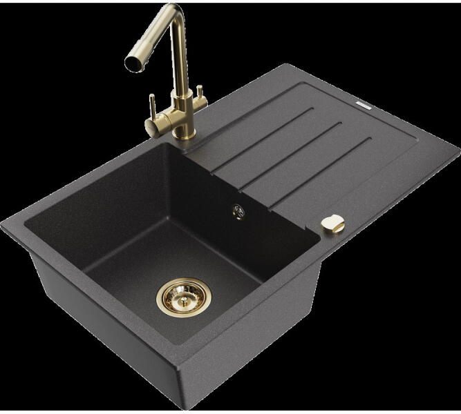 Mexen Tomas, gránit mosogató 800x500x190 mm, 2 kamrás és fekete Duero csaptelep, fekete - arany metál, 6516-75-671600-70-B A konyhai mosogató műszaki adatai: Gyártó: Mexen Sorozat: Tomas Modell: 2-kamrás csepptálca nélkül Felszerelés: munkalapra Szín: fekete - arany metál Felület: sima Hossza 800 mm Szélesség 500 mm Magasság: 190 mm Kamra mélysége: 180 mm (nagyobb), 180 mm (