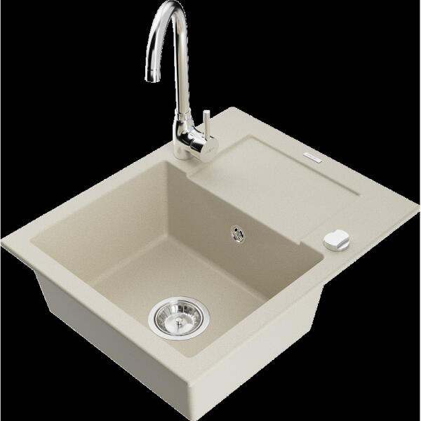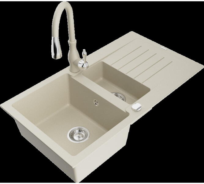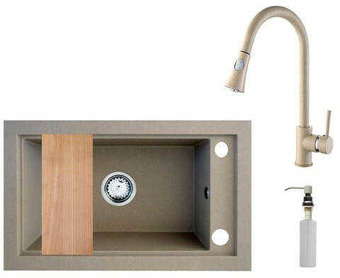 Panama gránit mosogató homokbézs színben, extra nagy medencével. A teljes készlet tartalmazza a mosogatót, a csaptelepet, a szifonkészletet, a mosogatószer adagolót és egy vágódeszkát. A medence mérete 51,7 x 31,6 cm, amiben szinte bármilyen méretű edény elfér. Modern megjelenésű, letisztult szögletes formavilág jellemzi, kiváló eleme lehet egy minimál vagy modern stílu