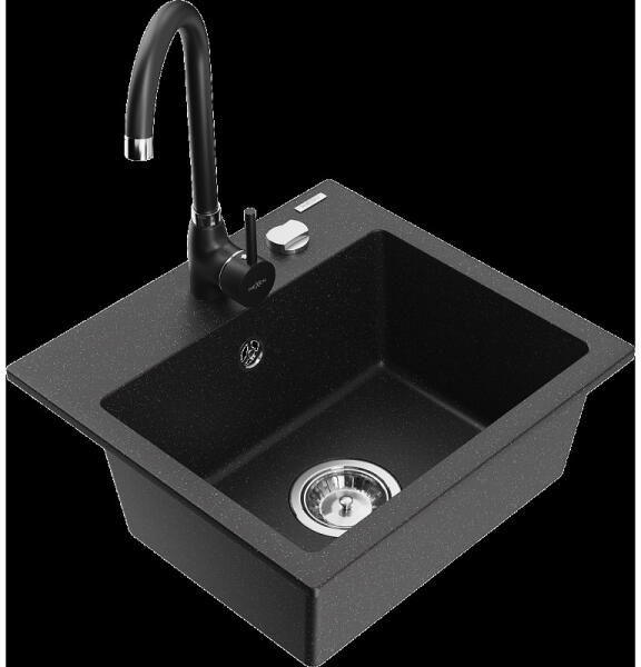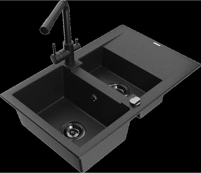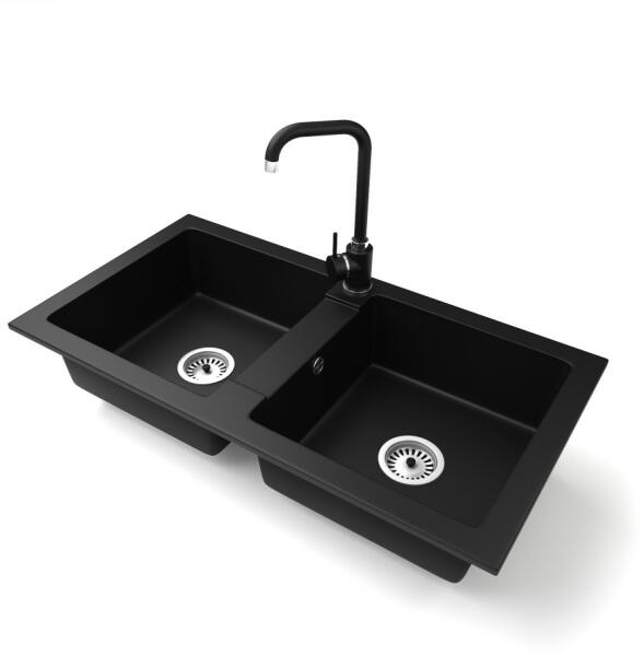 NERO Lybra gránit mosogatótálca matt fekete színben. Kétmedencés, szimmetrikus elrendezésű mosogató, a csaptelep számára kialakított lyukkal a medencék közötti felső pontban. Letisztult formatervezés, kiemelkedő anyagvastagság jellemzi, ezáltal rendkívük masszív és ellenálló konstrukció. Anyaga 80% gránit őrlemény és 20% akril, ami megfelel a szabvány gránit mosoga
