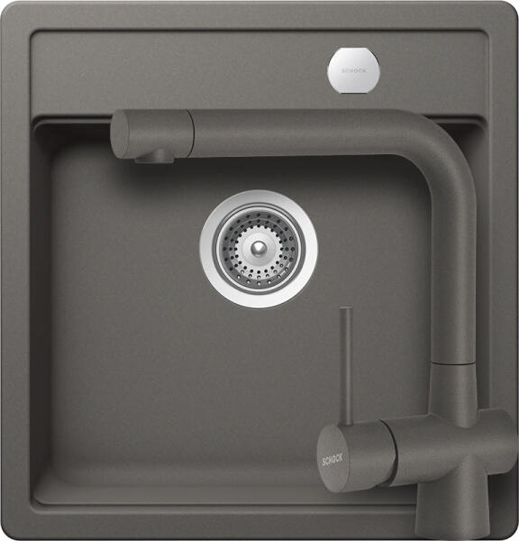 Schock Mono N-100S konyhai mosogatótálca Cristadur Silverstone 490 x 510 mm lefolyó távműködtetővel, gránit, hagyományos beépítés, sötétszürke munkalapba beépíthető, egymedencés, csepegtető nélküli, ideálisan illeszkedik a minimum 50 cm-es alsószekrényhez. A csaptelep helye előre elkészített, könnyedén áttörhető. A csomagban találja a használati útmutatót, amel