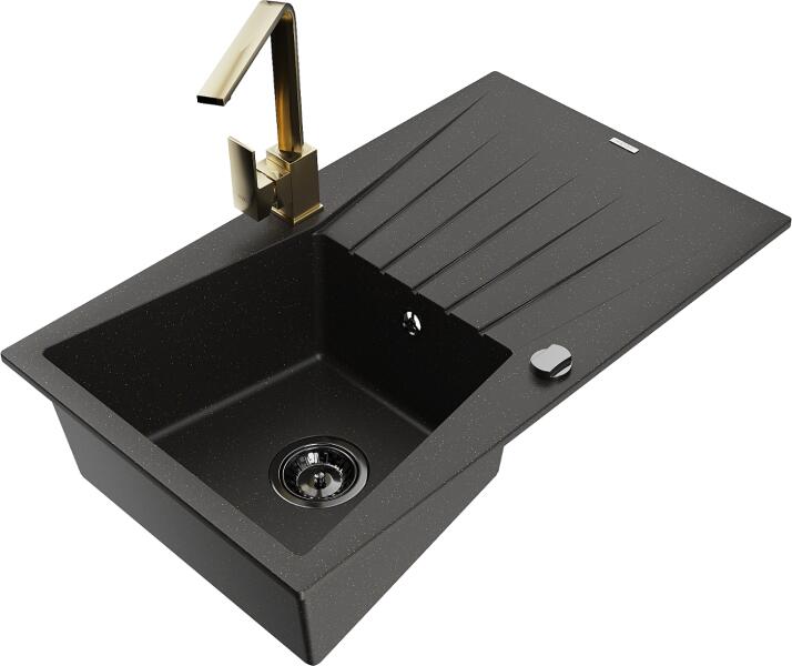 Mexen Cesar, gránit mosogató 775x470x190 mm, 1 kamrás, fekete-arany metál fekete szifonnal és arany Rita mosogató csapteleppel, 6514-75-670300-50-B A konyhai mosogató műszaki adatai: Gyártó: Mexen Sorozat: Cesar Modell: 1 kamrás Felszerelés: munkalapra Szín: fekete - arany metál Felületkezelés: sima Hossza 775 mm Szélesség 470 mm Magasság: 190 mm Kamra mélysége: 180 mm Kamra