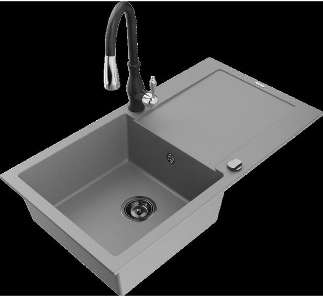 Mario konyhai mosogató: Méretek: 820x436x161 mm Kamra mélysége: 151 mm Kamra méretei: 356x336 mm Lefolyó átmérője: ø90 mm Típus: 2 kamrás Típus: felülről a munkalapba süllyesztve Anyaga: gránit (80% gránit adalékanyag 20% gyanta) Túlfolyó lyuk: igen Lyukak: 2 (1 x mosogató csaptelep, 1 x automatikus leeresztő csavar vezérlés) Nagy ellenállás a karcolásokkal és elszíne